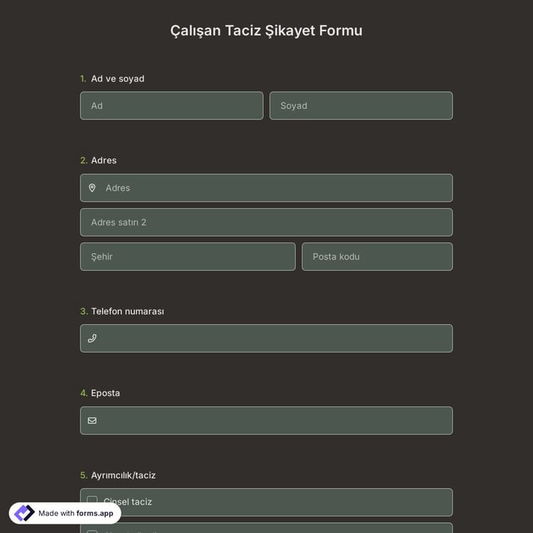 Özel bir çalışan taciz şikayet formu kullanmak, çalışanlarınızın saniyeler içinde şikayette bulunmasına olanak tanır. Bu şekilde durumu inceleyebilir ve gerekli aksiyonları alabilirsiniz. forms.app üzerinde çalışan taciz şikayet formu şablonunu açtıktan ve işletmeniz için özel bir form oluşturduktan sonra, form bağlantısını görünür bir yere eklediğinizden emin olun. Bu caydırıcı bir faktör olarak etki edecek ve çalışanlar için erişilebilirliği artıracaktır.
