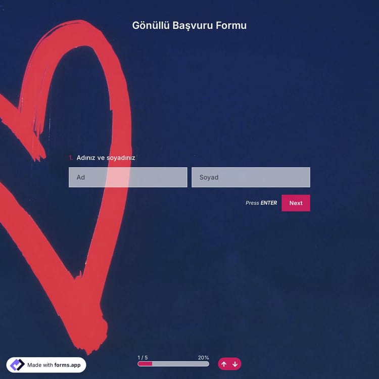 Gönüllüler, her başarılı kar amacı gütmeyen kuruluşta kilit bir rol oynar. forms.app ile potansiyel gönüllülere ulaşmak göz kırpmak kadar kolaydır. Formunuzu oluşturmak ve kuruluşunuz için gönüllülerle tanışmaya başlamak için ücretsiz gönüllü başvuru formu şablonumuzu kullanın!