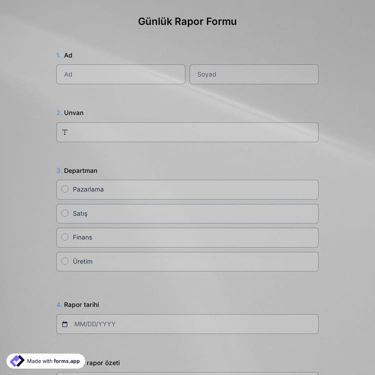 forms.app'in size sunduğu bu günlük rapor formu şablonuyla, çalışanlarınızdan günlük olarak rapor ve içgörü toplamak kolaydır. Ayrıca bu raporları 'Sonuçlar' bölümünden yönetebilir veya kolay entegrasyonlar sayesinde Google E-Tablolar gibi üçüncü parti uygulamalara aktarabilirsiniz. Kullanımı tamamen ücretsizdir ve hiçbir kodlama becerisi gerektirmez!