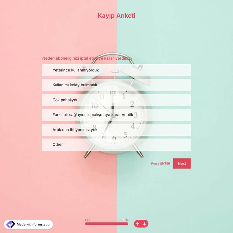 Bazen müşteriler ürünlerinizi veya hizmetlerinizi kullanmayı bırakabilir. Bu doğal bir olay olsa da, ayrılma nedenlerini bilmeniz gerekir. Bu size değerli bilgiler sağlayacak ve ürün ve hizmetlerinizi geliştirmenize yardımcı olacaktır. Bu nedenle, forms.app'in ücretsiz kayıp anketi şablonuyla başlayın ve anketinizi bugün oluşturun.
