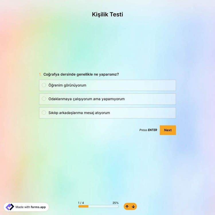 İnsanlara kendilerini daha iyi tanımaları için bir şans vermek ister misiniz? Bu ücretsiz kişilik testi şablonuyla, ziyaretçileriniz ve okuyucularınızla paylaşmak için kolayca kendi çevrimiçi testlerinizi oluşturabilirsiniz. Sayısız kullanışlı özellik ve seçeneğe sahip, kullanımı kolay bir sınav oluşturucu olan forms.app'i şimdi kullanın!