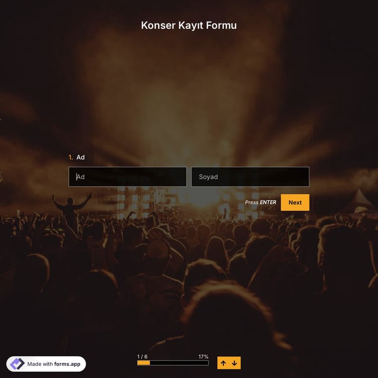 Bir konser kayıt formu, online kayıtları mümkün kılar ve bilgi ve ödeme toplamanıza yardımcı olur. Bu formlar sayesinde insanların bilet gişesine gidip online olarak konser kaydı yapmasına gerek kalmayacak. Konser türü ne olursa olsun, forms.app'ın konser kayıt formu şablonu, hızlı ve zahmetsizce başlamanızı sağlar!