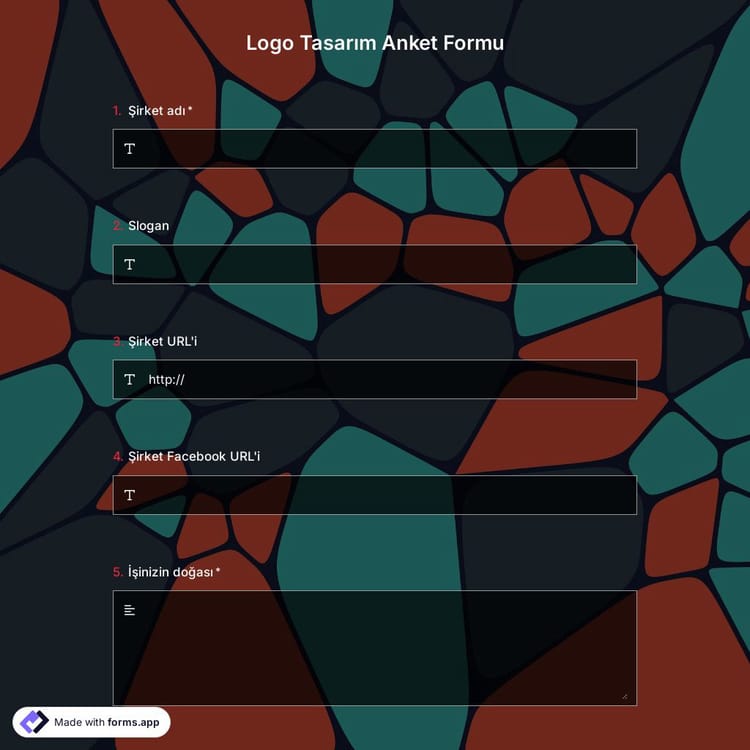 Bir markanın logosu, müşterilere marka stratejisi ve kurum kültürünü tanıtır. Bu yüzden tasarım aşamasında ajanslar ve şirketler arasında doğru bilgi akışı sağlanmalıdır. forms.app’in Online Logo Tasarımı Anketi ile logo tasarlamak hiç olmadığı kadar kolay! Hemen form şablonunu özelleştirerek ya da sıfırdan bir form tasarlayarak başlayabilirsiniz.