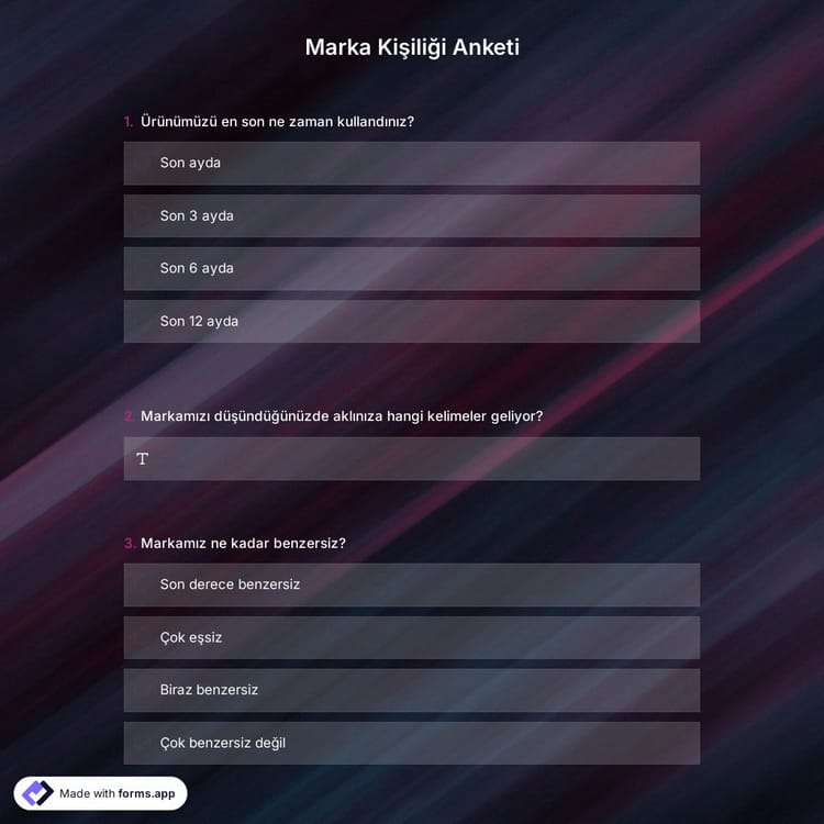 Marka kişiliğinin tanımı bile, marka özelliklerini anlamanın ne kadar hayati olduğunu, sizin veya hedef kitlenizin markayı nasıl algıladığını anlatır. Bu tamamen ücretsiz marka kişiliği anket şablonu, sorulacak tüm genel soruları içerir ve form oluşturma sürecinde size çok yardımcı olacaktır. İşletmeniz hakkında daha fazla bilgi edinmek için Pazar Araştırması Anketlerine de göz atabilirsiniz. Bu şablonu seçin ve formunuzu şimdi ücretsiz oluşturmaya başlayın!