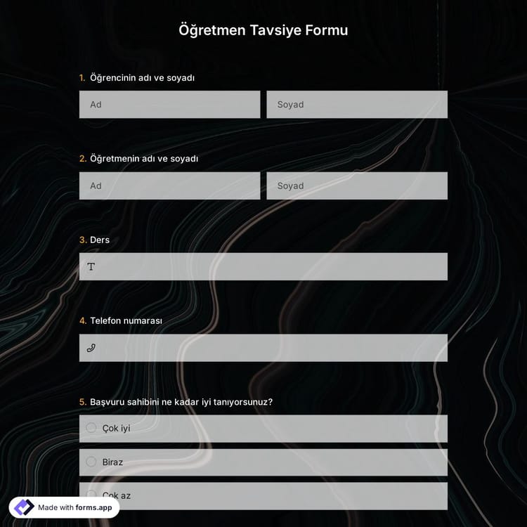 Bir tür istek formu olan forms.app Öğretmen Tavsiye Formu Şablonu’nda standart birkaç soru vardır:
