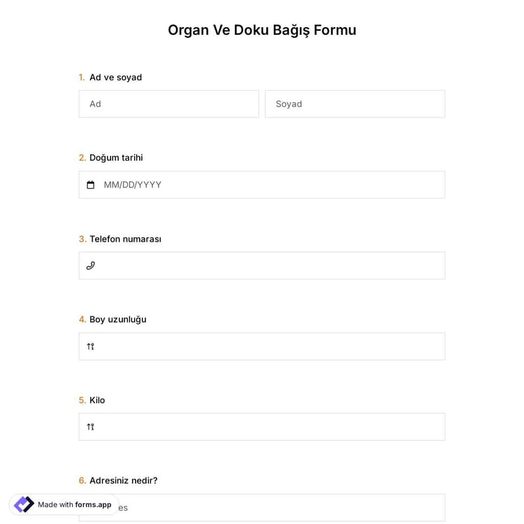 Evrak işlerini azaltmanın yanı sıra, online bir organ bağış formu da daha fazla organ bağışçısına ulaşmayı mümkün kılacaktır. Form örneğini ihtiyaçlarınıza göre özelleştirdikten sonra, örneğin bağışçılara özel seçenekler ekleyerek formu kolayca sosyal medyada paylaşabilir, e-posta yoluyla gönderebilir veya web sitenize yerleştirebilirsiniz. İnsanlar formlarını gönderdikten sonra, onları herhangi bir cihaza indirebilir ve yazdırabilirsiniz. forms.app'in organ ve doku bağışı formu şablonu, organ bağışını kolaylaştırır!