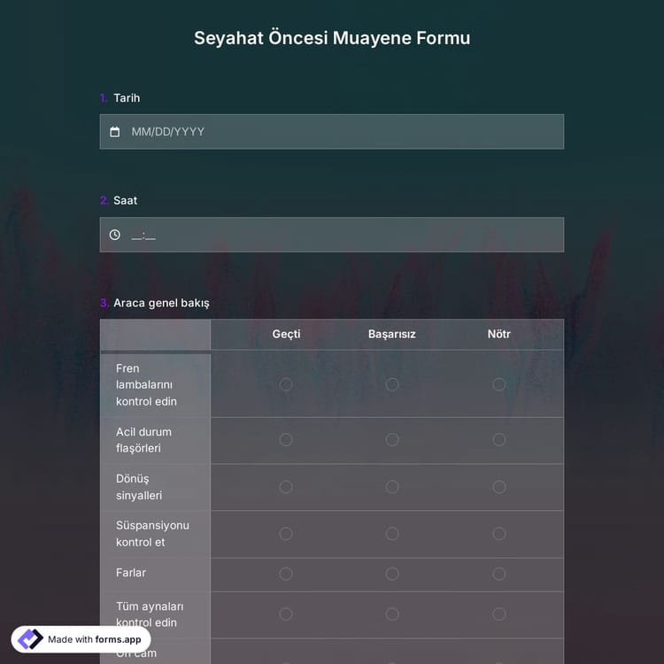 Araç sahibi ya da araç muayene şirketi patronu olabilirsiniz. Bu seyahat öncesi muayene kontrol listesi, yola çıkmadan önce size aracınızda neyin iyi durumda neyin arızalı olduğunu bildirir. Hemen bir şablon ile başlayıp özelleştirerek formu kullanmaya başlayabilirsiniz.