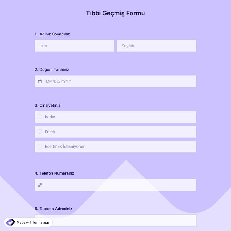 Hastanın tıbbi geçmişini kolay bir şekilde öğrenmek istiyorsanız, çevrim içi tıbbi geçmiş formu tam size göre. forms.app ile dakikalar içinde özel bir form oluşturabilirsiniz. Ayrıca, formlarımız mobil cihazlarla uyumludur ve her yerden erişilebilir. Neden bekliyorsunuz? Hemen başlayın!